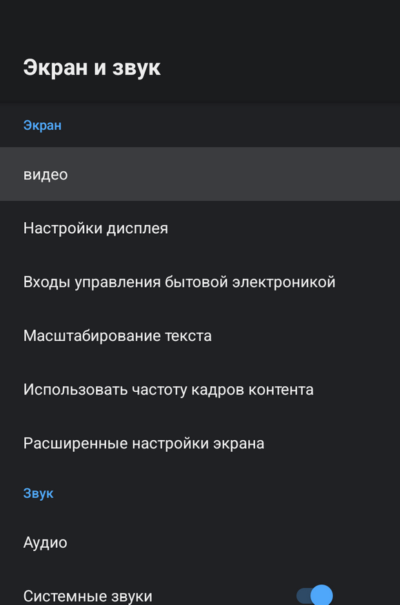 Пройдемся по настройкам и изучим возможности приставки. Наиболее полезным является раздел «экран и звук». В параметрах видео можно выбрать разрешение экрана (от 720p до 4К) и частоту обновления (от 23,98 до 60 Hz). Для удобства частота обновления в настройках округляется до цельных чисел, но приставка поддерживает и дробные частоты 23,98\29.97\59,94.