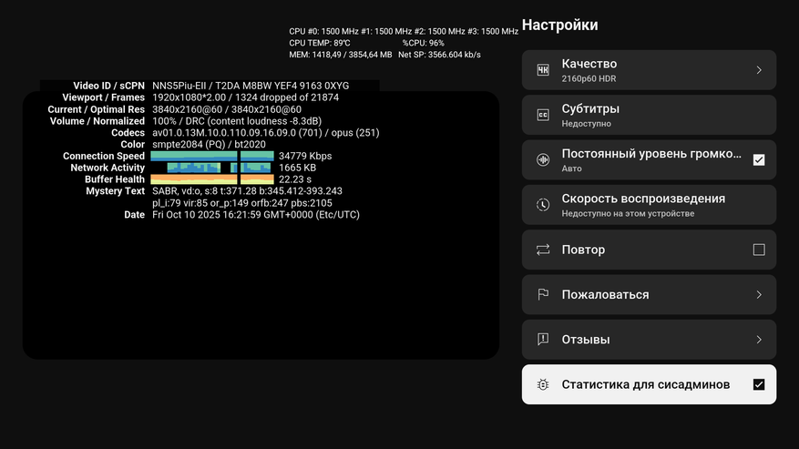 Что касается температуры при использовании по прямому назначению. Если брать обычные задачи, вроде онлайн кинотеатров или IPTV, то температура находится в пределах 65 — 70 градусов, иногда поднимается до 75 градусов (HD каналы или 4К качество). Это нормально, хотя если доработать систему охлаждения, то будет гораздо лучше. Но в Youtube при воспроизведении 4К HDR температура доходит до 90 градусов и это уже конечно перебор. Причем с ютубом есть и другой эпикфейл: в качестве 4К\60 HDR с форматом AV1 приставка дропит! И это уже напрямую указывает на программную проблему, т. к сам чипсет без проблем тянет это качество без дропов.