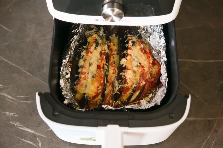 Первые 15 минут аэрогриль работал в режиме Овощи с установленной по умолчанию температурой 165 °C. Работал бы и дальше, но уж очень медленно шло запекание. Для баклажанов такого нагрева все-таки маловато.