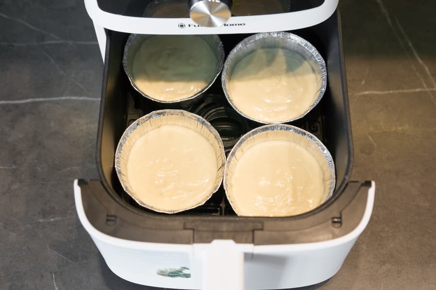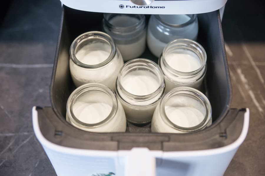 Напоследок мы проверили стабильность нагрева на низкой температуре в течение длительного времени — приготовили йогурт. Взяли 700 мл молока жирностью 3,2%, 300 мл сливок жирностью 20% и 240 г 2%-ного греческого йогурта без добавок. Молоко не подогревали. Смешали всё венчиком до однородной консистенции и разлили по баночкам. Установили их в чашу и запустили аэрогриль в режиме Йогурт на 8 часов. Предложенную температуру в 40 °C оставили без изменений. Больше к устройству не подходили и в процессе внутрь даже не заглядывали.