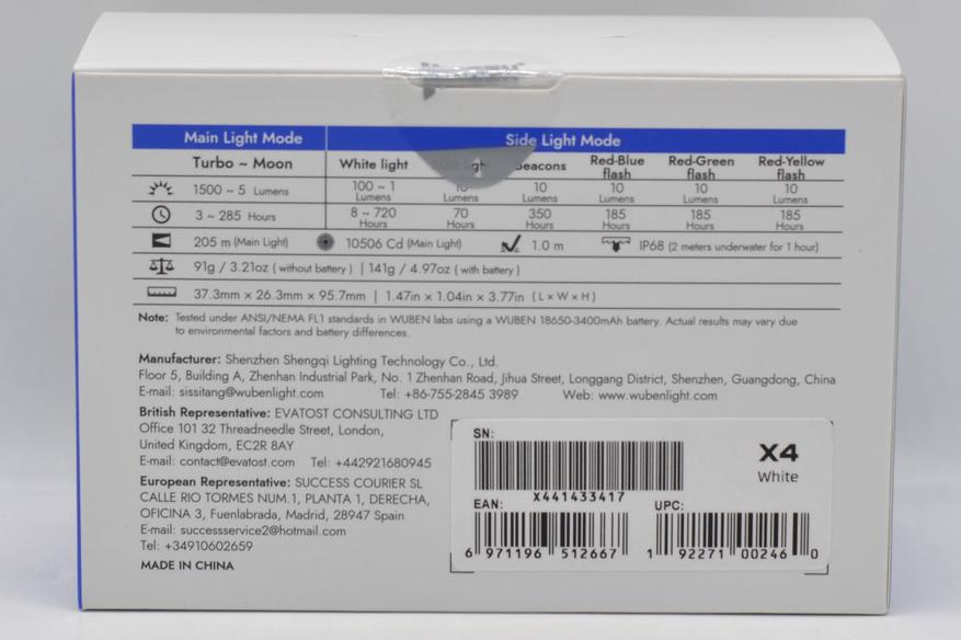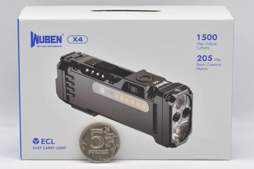 Доставка в надежной транспортной коробке. Коммерческие коробки у Wuben с изюминкой, открываются в разные стороны, покупателя надо удивить на этапе знакомства с фонарем. Характеристики нанести не забыли.
