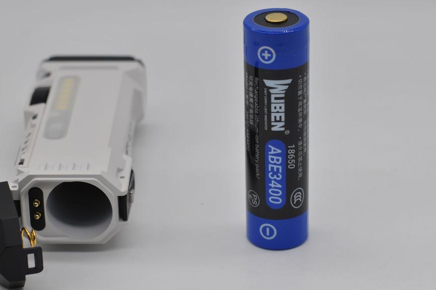 Тут используется элемент 18650 с фирменной маркировкой ABE3400. Масса 51 г. Подойдут и другие элементы с защитой и без (с обоих концов в корпусе пружины).