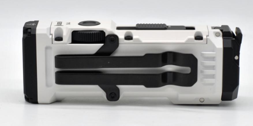 Сбоку (справа) полоска 4 см с 7-ю светодиодами (6 белого света и один для RGB). Снизу блокировка крышки аккумуляторного отсека. Заявлена защита корпуса IP68 — пыленепроницаемость и возможность погружения в воду на 2 метра (до 30 минут).