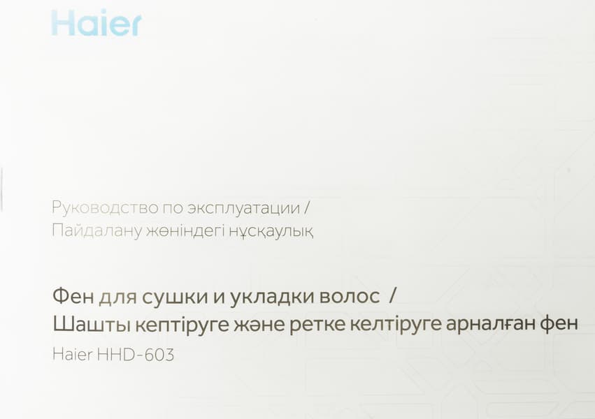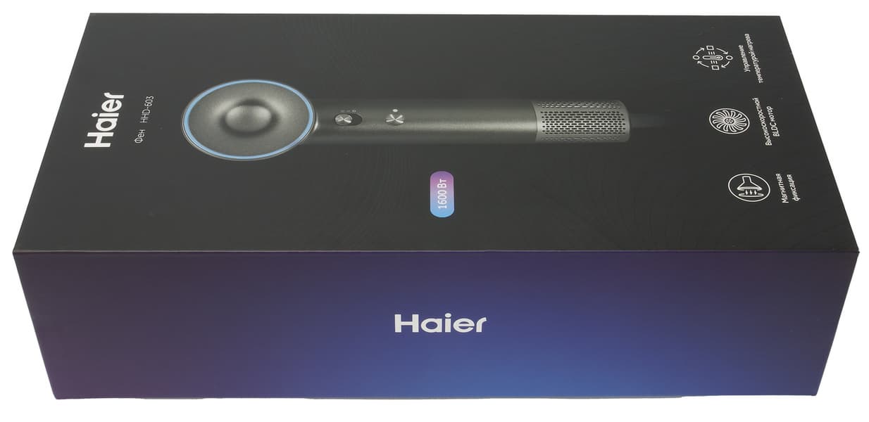 Haier HHD-603 поставляется в симпатичной небольшой коробке из прочного толстого картона с качественной цветной полиграфией. На лицевой стороне размещена фотография фена, рядом с ней — логотип бренда, уровень мощности и пиктограммы с обозначением главных особенностей модели. С обратной стороны — краткая техническая информация и данные о производителе.