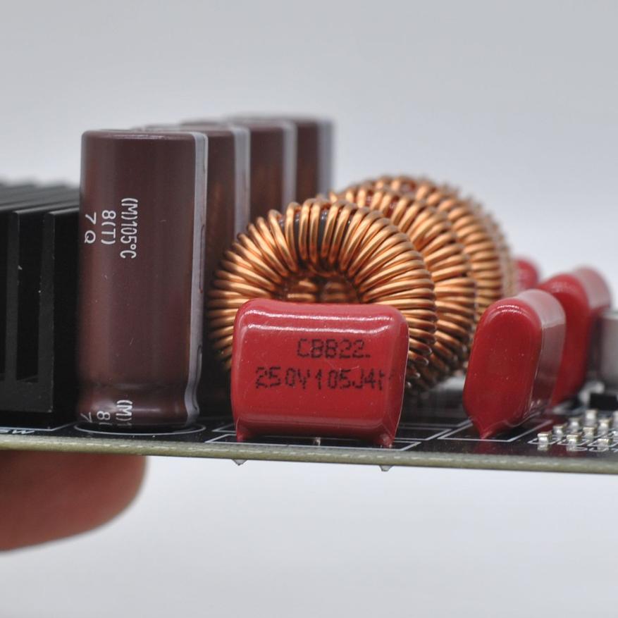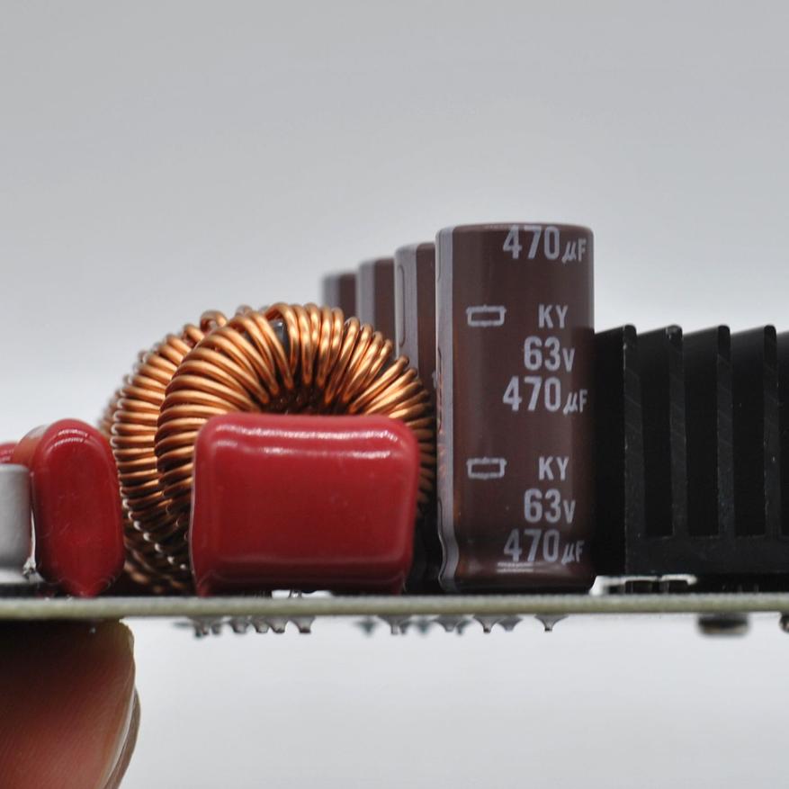 Электролиты в питании на напряжение 63 В, в выходном фильтре полипропиленовые пленочные конденсаторы 1 мкФ и крупные индуктивности, а около входного разъема — танталовые конденсаторы (капли).