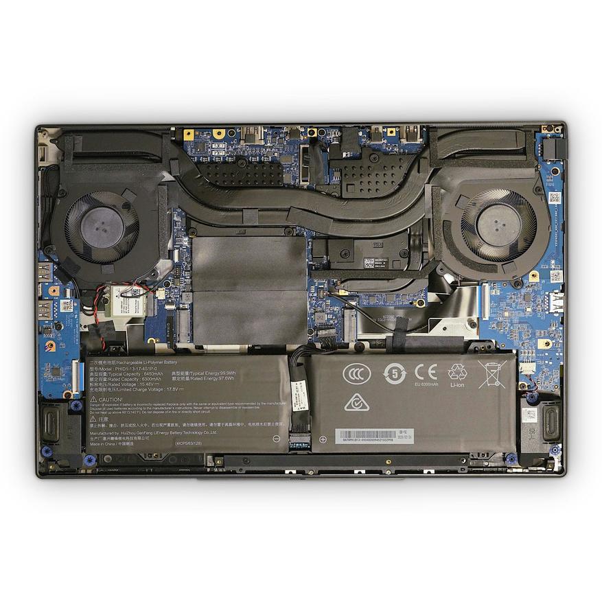 Экран с углом открытия в 180° тоже нельзя назвать слабой стороной. Здесь установлена IPS-матрица с разрешением 2560x1600 точек, соотношением сторон 16:10, контрастностью 1200:1, частотой обновления 300 Гц, яркостью 500 кд/м² и охватом 100% стандартного цветового пространства sRGB. Батарея емкостью 99 Вт·ч рассчитана на 10 часов автономности при легких задачах, а подзарядка производится как с помощью Type-C (до 140 Вт), так и через комплектный 240-ваттный адаптер.