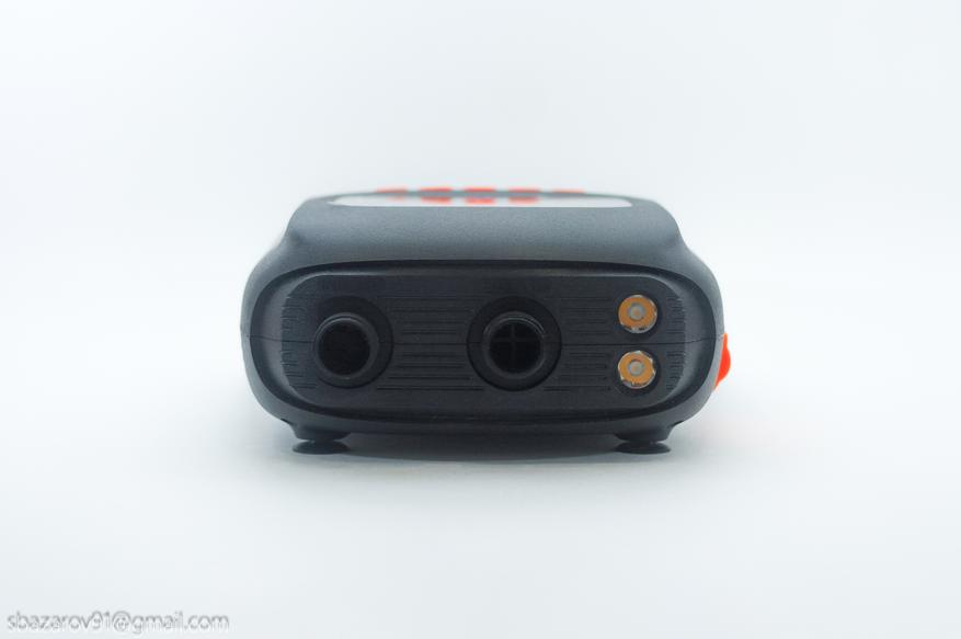 На правом боку яркая резиновая заглушка, прикрывающая три разъёма:
