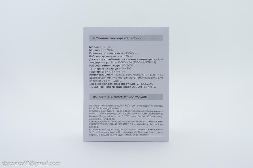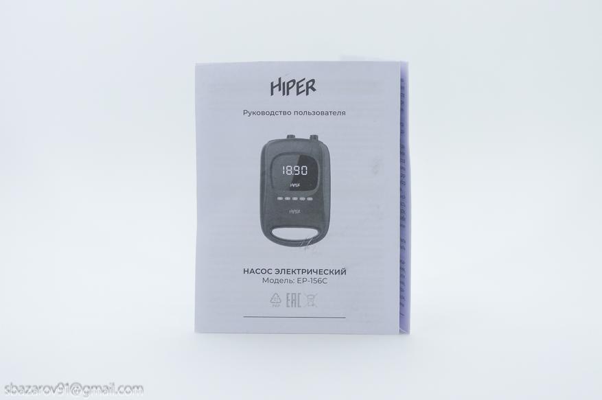 Электрический насос HIPER EP-156C поставляется в ярко-фиолетовой упаковке с изображением устройства и его комплектации.