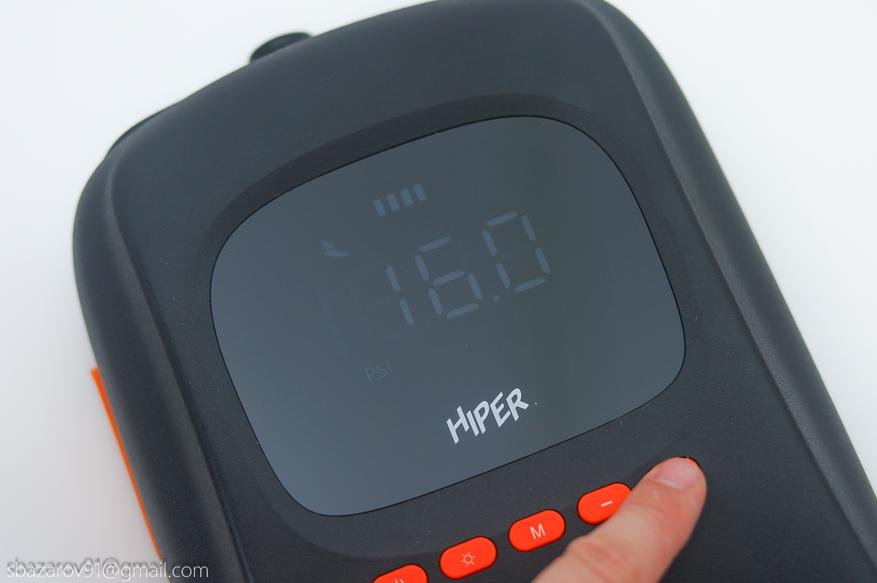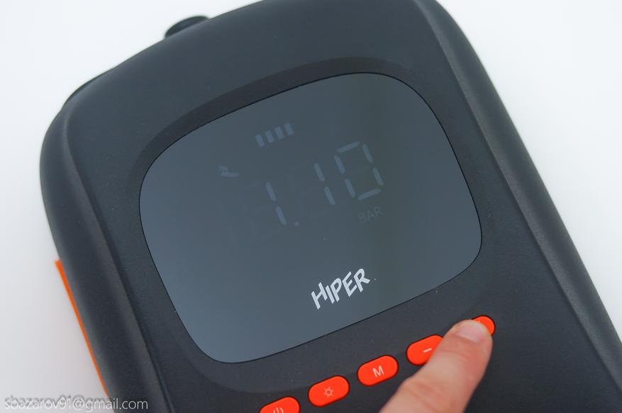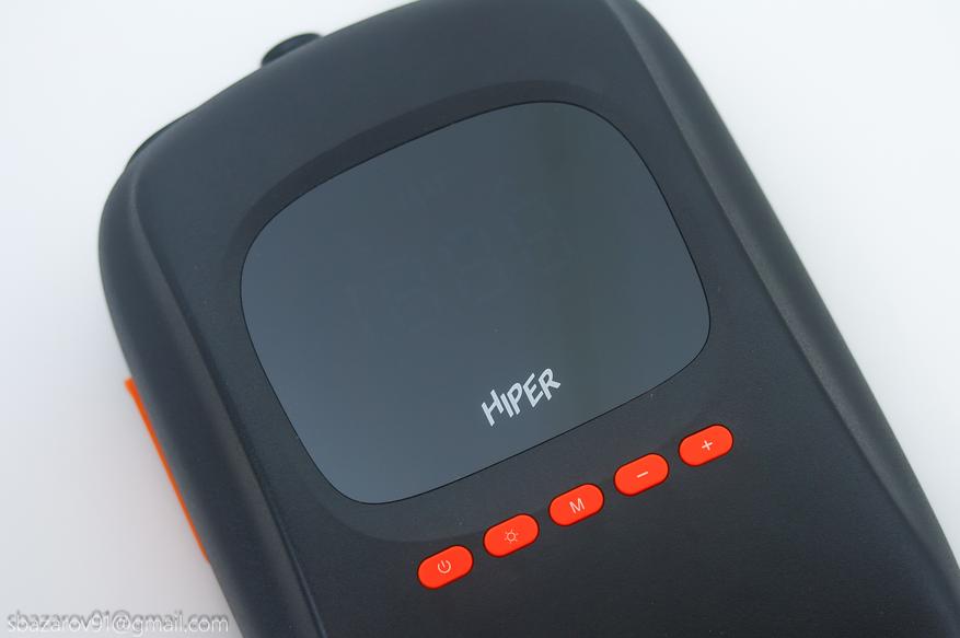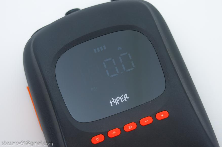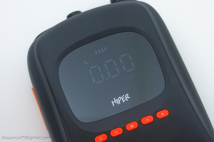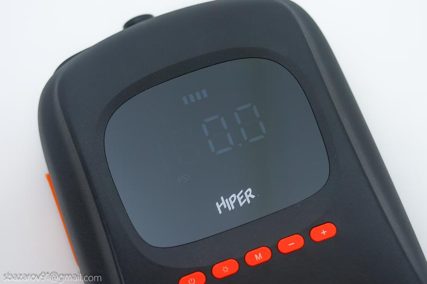 Электрический насос HIPER EP-156C имеет узнаваемый дизайн, особенно если вы уже сталкивались с подобными устройствами. Для удобной транспортировки и переноски имеется ручка в верхней части, подключение шланга подкачки осуществляется снизу, а мониторинг давления происходит через экран в центре устройства. Материалы подобраны строго — матовый черный пластик, который не собирает отпечатки и скрывает следы эксплуатации (в отличие от Cycplus D14 Pro, выполненного из белого пластика и получившего непотребный внешний вид за один год использования).