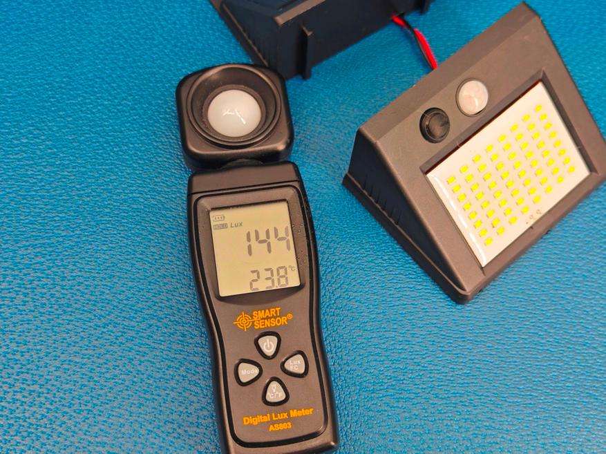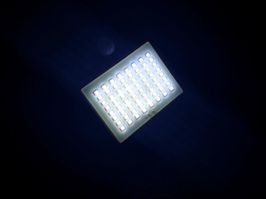 Матрица светит равномерно, если пульсации от ШИМ, но не критичные для уличного освещения. В двух режимах фонарь дает около 150 и 30 люкс. Второй режим, соответственно, более экономичный и долгоиграющий — предпочитаю именно этот режим.