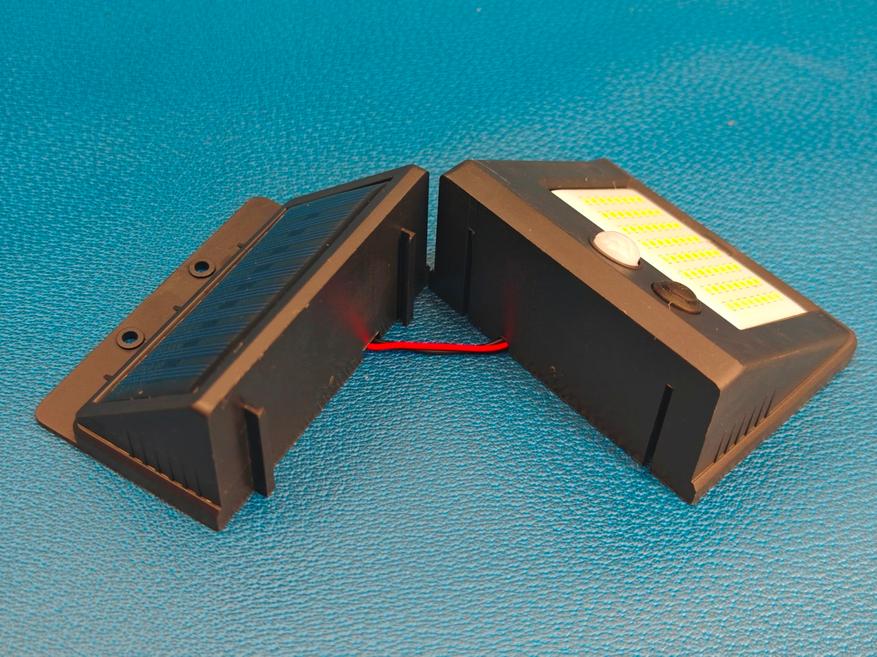 Это решение напрашивалось — использование выносной солнечной батареи. В этом фонаре реализовано довольно интересно — корпус состоит из двух частей, которые можно скрепить друг с другом или разъединить. Соединяются части с помощью двойного провода. Это решение позволяет закрепить солнечную батарею выше козырька или выбрать освещенное место. А сам фонарь размещаете там, где это необходимо.