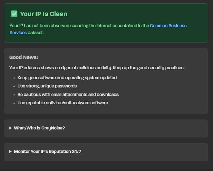 Компания GreyNoise Labs запустила бесплатный сервис GreyNoise IP Check, который позволяет пользователям проверять, был ли их IP-адрес замечен во вредоносных операциях сканирования, таких как ботнеты и резидентные прокси-сети.