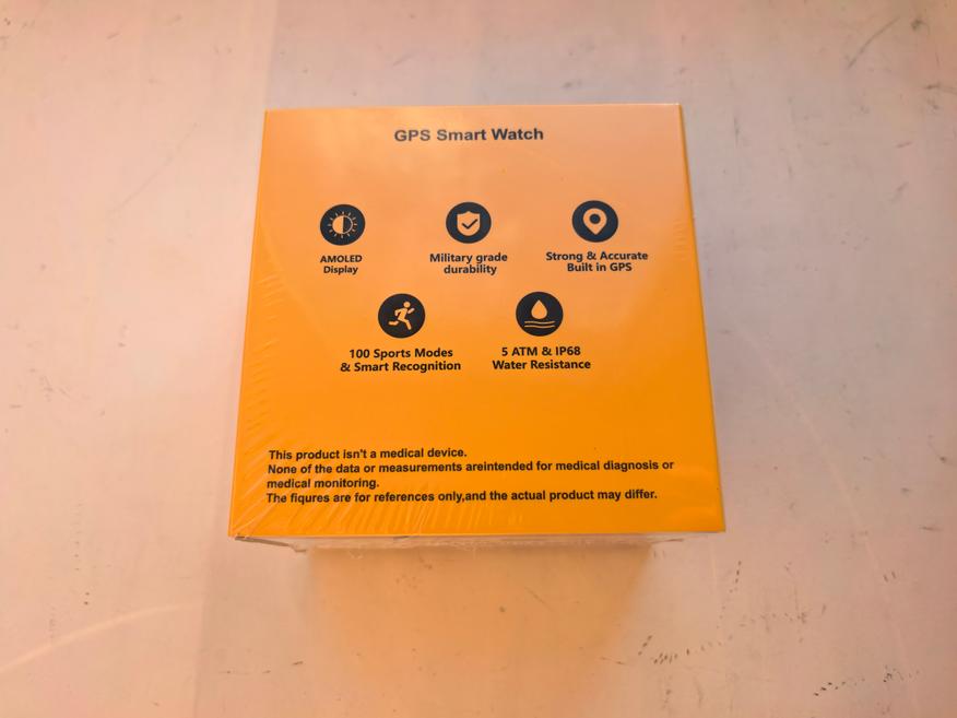 Коробка оранжевого цвета и указания основных характеристик в виде пиктограмм рассказывает о возможностях часов. Товар показан лицом пользователю. Можно сразу увидеть его возможности, выпирающее колесо вверху и кнопка внизу.