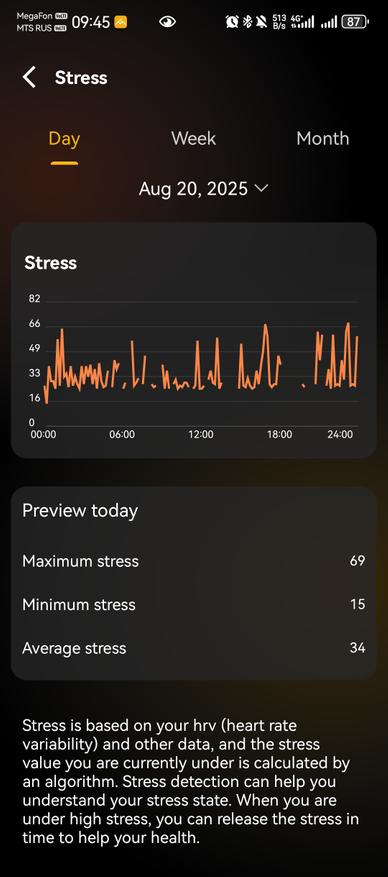На скриншотах показаны динамики пульса, кислорода в крови, стресса и активных часов. В начале дня, во время сна, пульс был ниже, чем весь оставшийся день. В его интервалах были пики и спады, что свидетельствует о некоторой активности. Уже из этого можно сделать вывод, как минимум, оценки товара соответствуют движению пользователя.