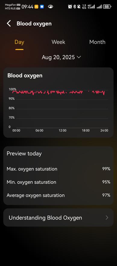 Представление всех показателей в приложении простое. Нет в нем красоты, избирательности и наполненности каждого типа оцениваемого показателя. В других программах можно проваливаться глубже, но и количество показателей у них больше. Для оценки каждого показателя надо находиться в покое, кроме пульса. Это видно по графикам ниже, что есть интервалы с незаписанными данными.