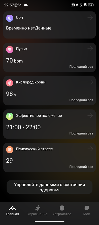 Вид на первую вкладку приложения показал ниже. Эту ночь я заряжал часы, поэтому сон не записался. Ошибок или пропусков сна у меня не было. В плане отслеживания своих заложенных в систему показателей часы работают без ошибок. Конечно, если спать всего два часа, или очень короткий промежуток времени, то он записан не будет. Legion Pro не могут записывать дневной (короткий) сон.