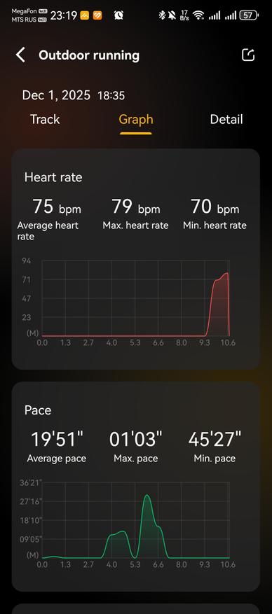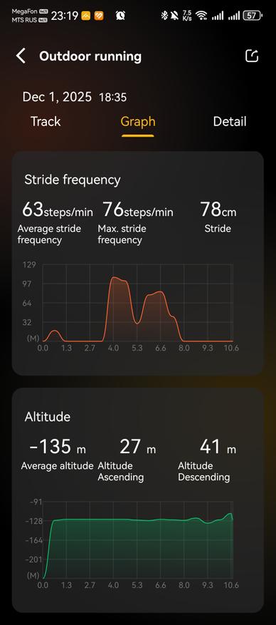 На следующих скриншотах показал, как выглядят экраны записанной тренировки. Если спутники не были определены до ее старта, то путь не будет показан. Спутники ищутся не очень быстро, но и не очень долго. Конечно, это занимает больше времени, чем у двухдиапазонной системы позиционирования.