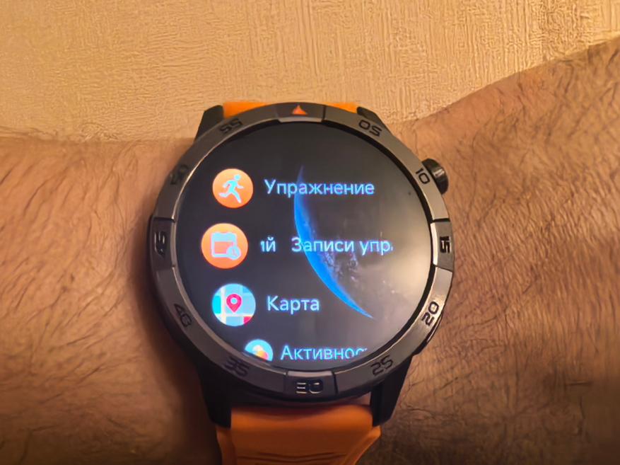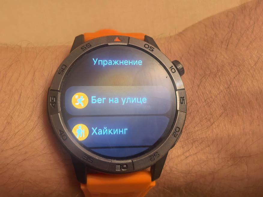 Верхняя кнопка крутится, нижняя только нажимается. К счастью для меня, как сказал в начале обзоре, колесо прокрутки не меняет циферблаты с первого экрана, но, к сожалению, оно вообще ничего не делает. Далее по меню можно перелистывать пункты. На каждой из них есть опции по нажатию и удержанию. Зажатие колеса прокрутки вызывает меню выключения, перезагрузки, а нижней — меню настроек. Однократное нажатие первой вызывает главное меню, второй — список спортивных активностей.