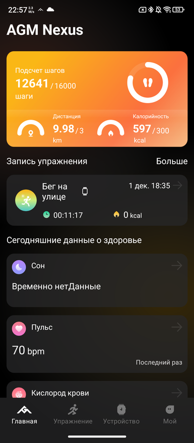 Опции по оценки пульса, кислорода в крови и стресса относятся к базовым. Их в той или иной степени адекватности умеют оценивать все фитнес-устройства. У кого-то получается лучше, у кого-то хуже. Разница формируется за счёт цены товара. Обозреваемые относятся к бюджетному классу по цене. Грубого нарушения логики в оценке любых из названых показателей я не увидел. AGM Legion Pro не медицинское устройство, но оно даёт первый взгляд на пульс, кислород в крови, стресс. Дополнительно на главном экране приложения вынесена динамика активных часов, когда я вставал, а не просто сидел за столом.