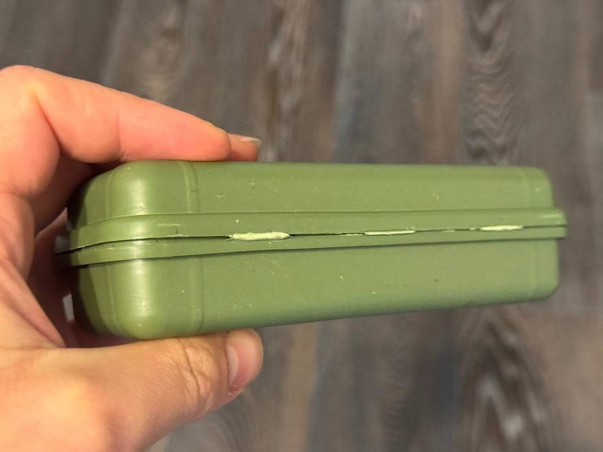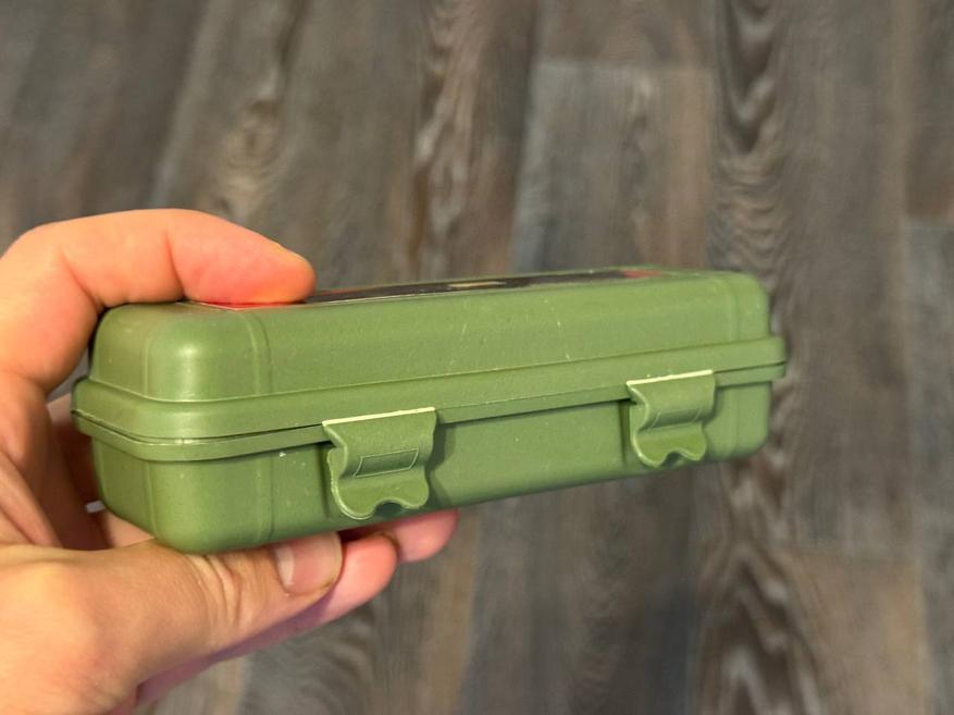 Поставляется фонарик в простом пластиковом кейсе зелёного (милитари) цвета. Сверху нанесено изображение самого фонарика, а также некоторые спецификации: тип аккумуляторной батареи, комплектация и модель фонаря.