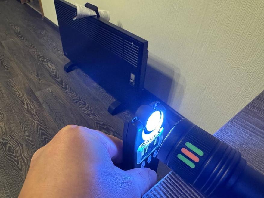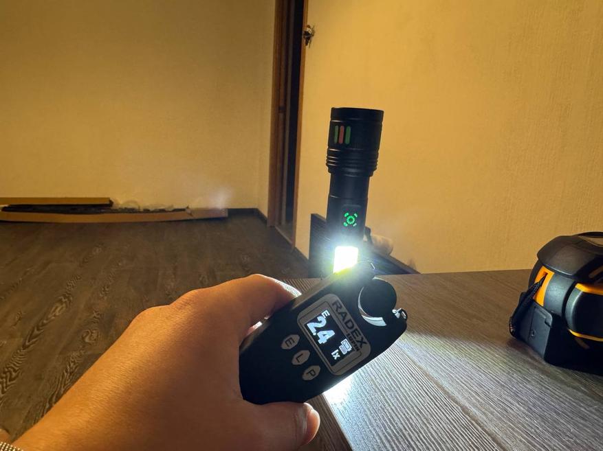 Для начала я включил фонарик и измерил световой поток у самой линзы при направленном пучке света. Получилось 9300 люкс. Затем я отдалил прибор на расстояние примерно 30 см и получил результат в 8100 люкс. Световой поток даже на расстоянии очень уверенный. У стены на расстоянии 4 м световой поток составил 288 люкс.