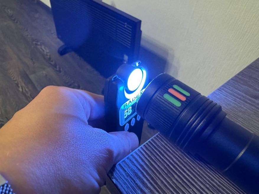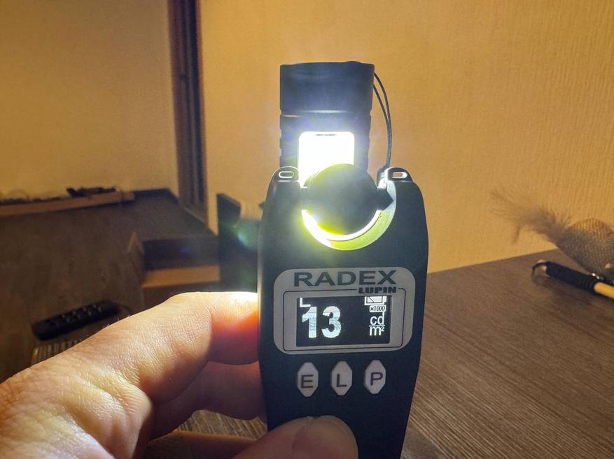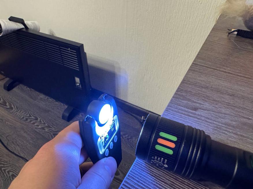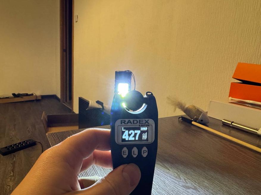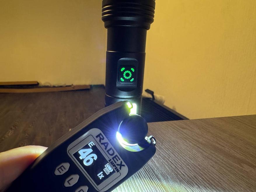 После зарядки фонарика я также измерил световой поток у самой линзы, и результат получился сильно выше первого — 58 000 люкс. У стены на расстоянии примерно 4 м световой поток пучка составил 1400 люкс.