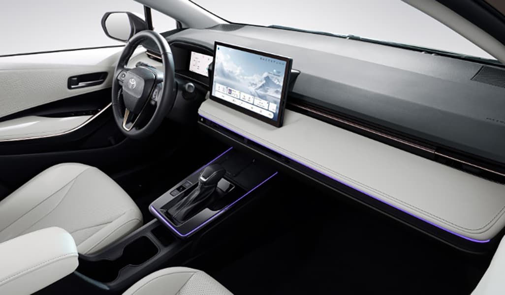 Салон выполнен в минималистичном черно-белом стиле. В оснащение входят 8,8-дюймовая цифровая приборная панель и крупный 12,9-дюймовый экран медиасистемы с поддержкой Apple CarPlay и Huawei HiCar. Среди опций — беспроводная зарядка мощностью 50 Вт для смартфона, 64-цветная атмосферная подсветка и скрытые дефлекторы обдува. За безопасность отвечает комплекс ассистентов Toyota Pilot, который входит в стандартное оснащение.