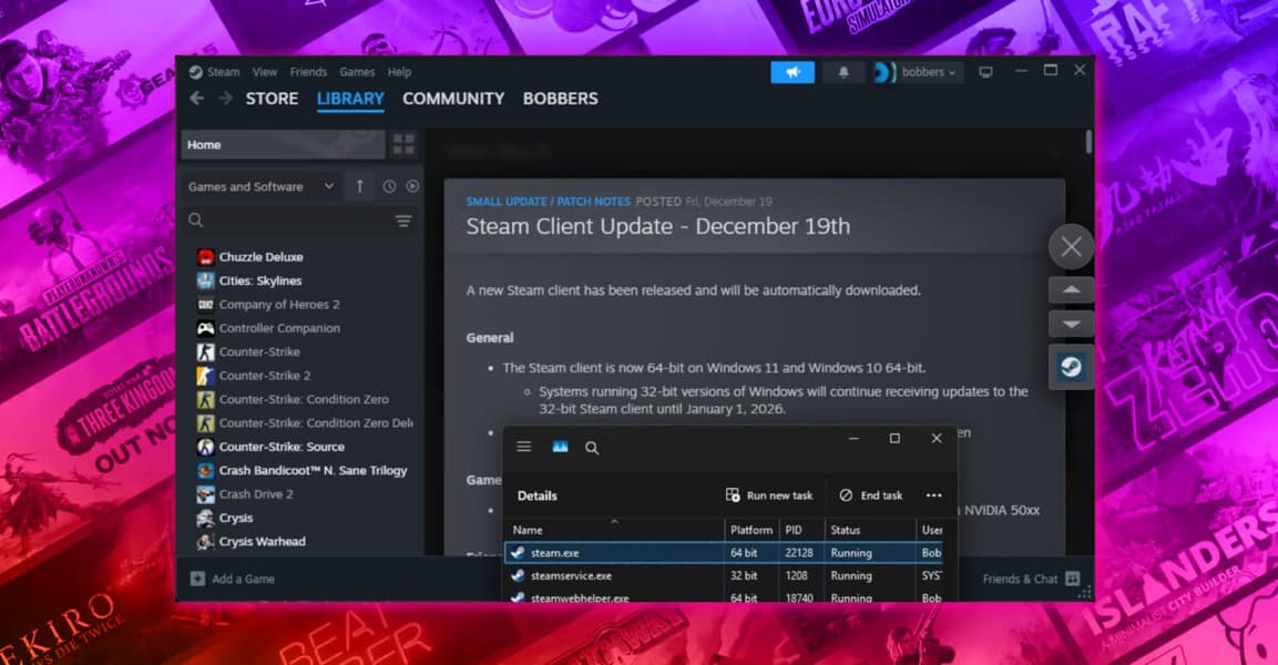 1 января компания прекращает поддержку 32-битной версии клиента Steam для Windows 10/11. Компания сообщила об этом в обновлении, которое вышло 19 декабря.