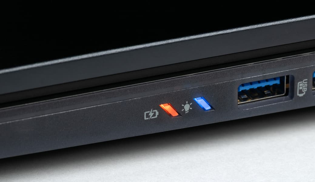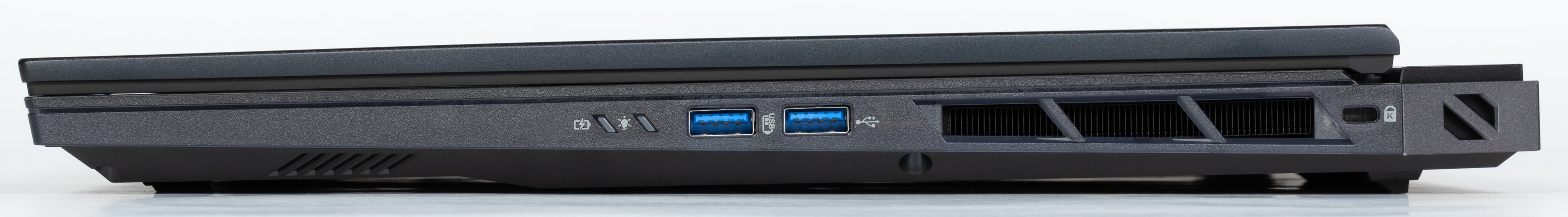 Справа — два индикатора (состояния батареи и включения ноутбука), два порта USB 3.2 Gen2 Type-A (один из них обеспечивает зарядку подключенных устройств при выключенном ноутбуке) и отверстие кенсингтонского замка.