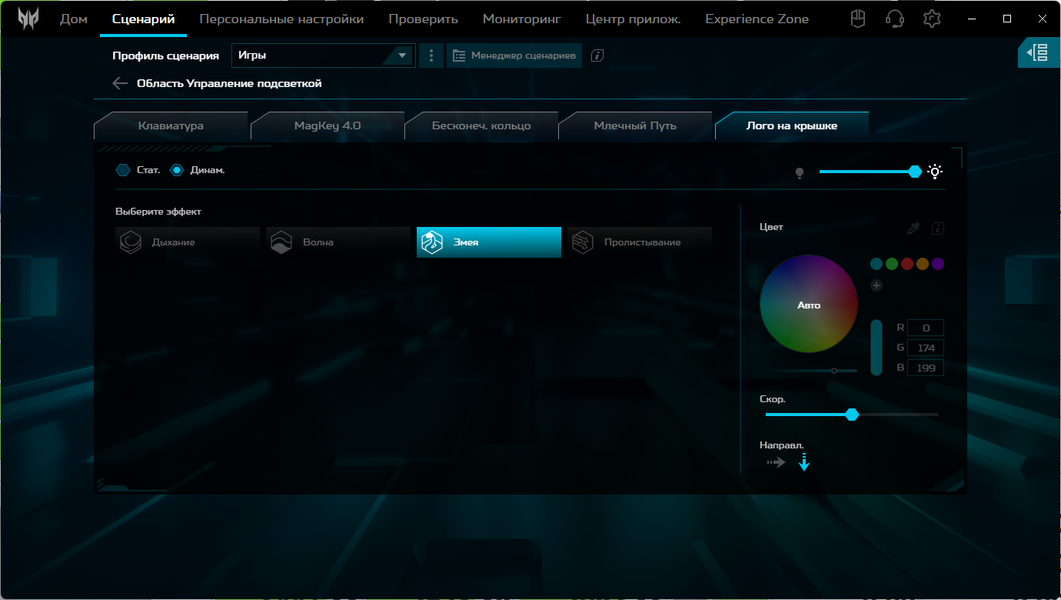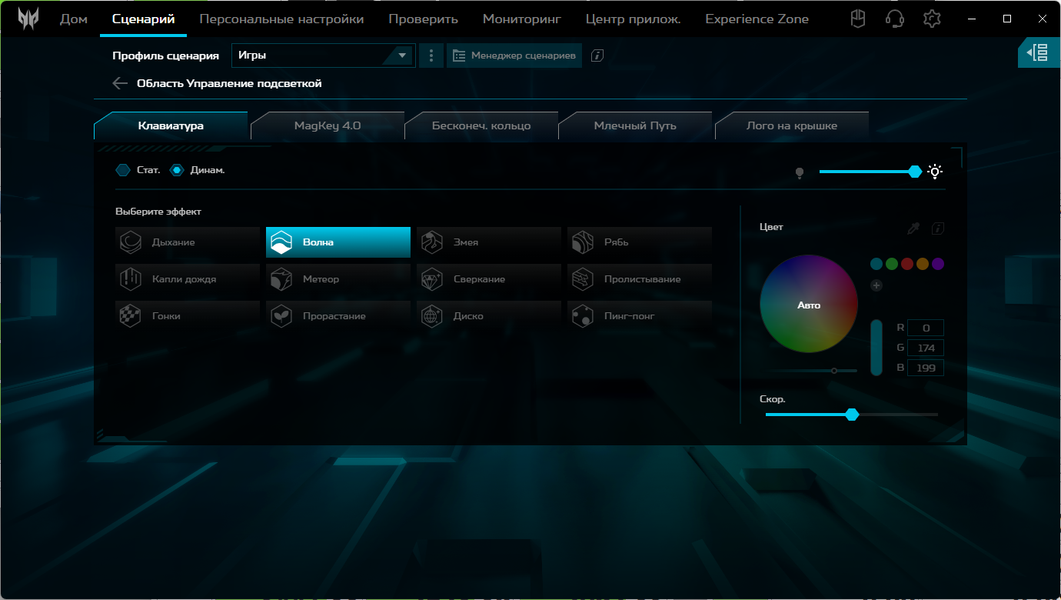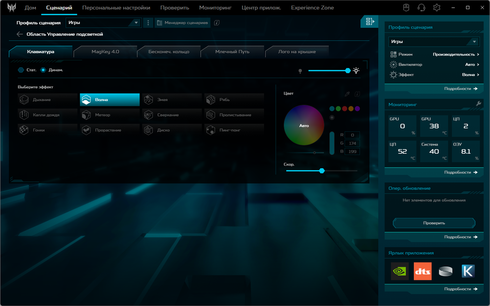 Для каждого из них можно задать один из четырех режимов работы CPU/GPU (но при питании от батареи режимов будет всего два), один из трех для вентиляторов и любой из множества эффектов подсветки (в том числе выключение).