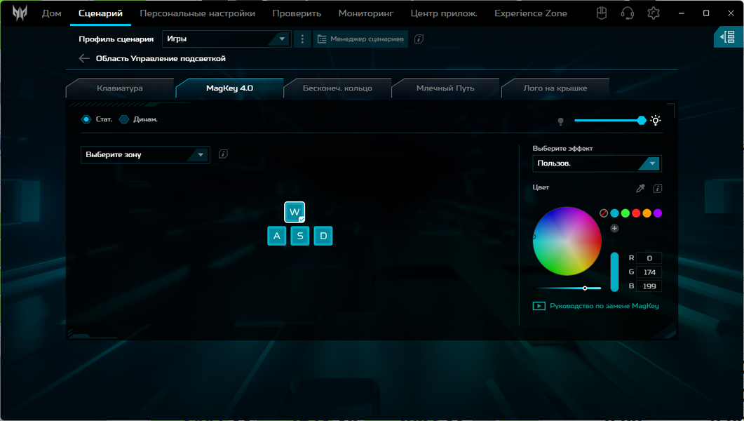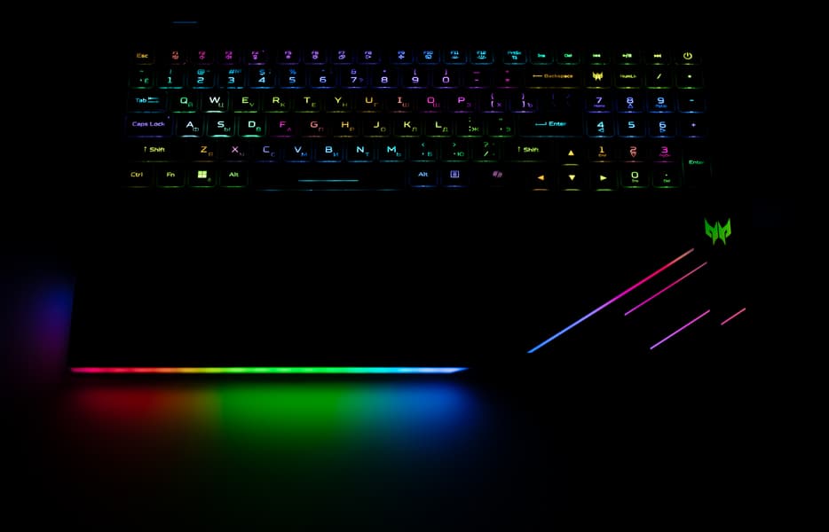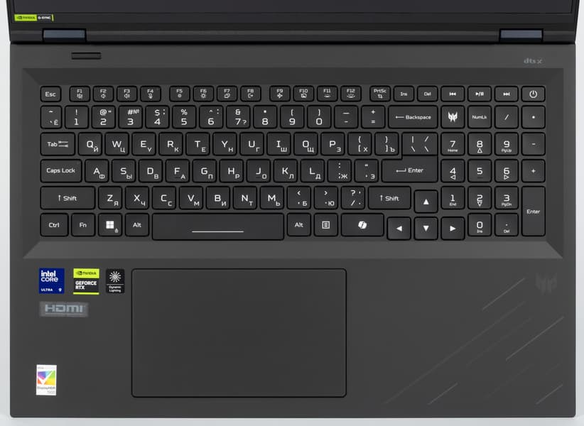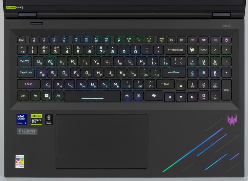 Предусмотрена динамическая RGB-подсветка с четырьмя уровнями яркости (пятое состояние — выключена), расширенное управление которой осуществляется из утилиты PredatorSense (для ее вызова рядом с клавишей Backspace предусмотрена специальная кнопка), а оперативное — сочетаниями клавиш. Подсвечиваются и символы, включая кириллицу, и края клавиш; сами символы контрастные (белые на черном), буквы латиницы крупные и хорошо читаемые, а кириллические немного мелковаты.