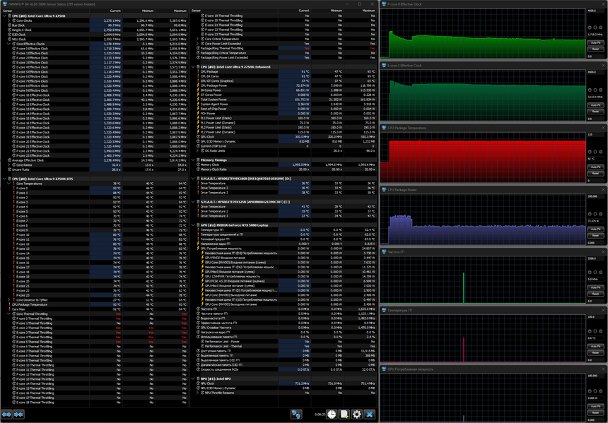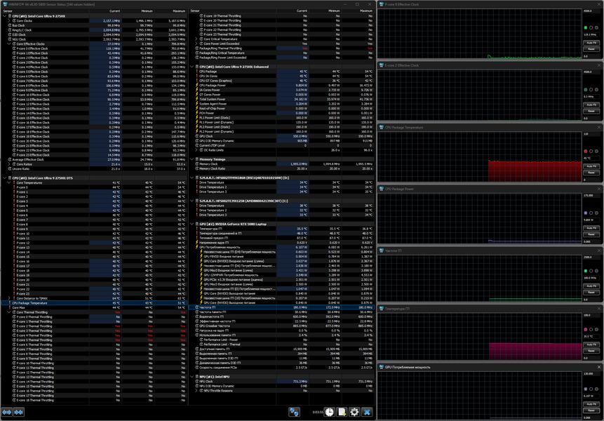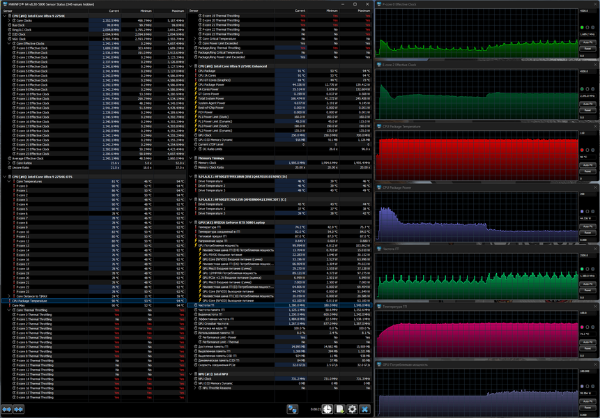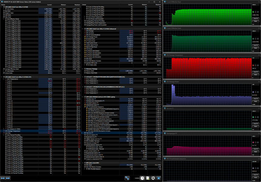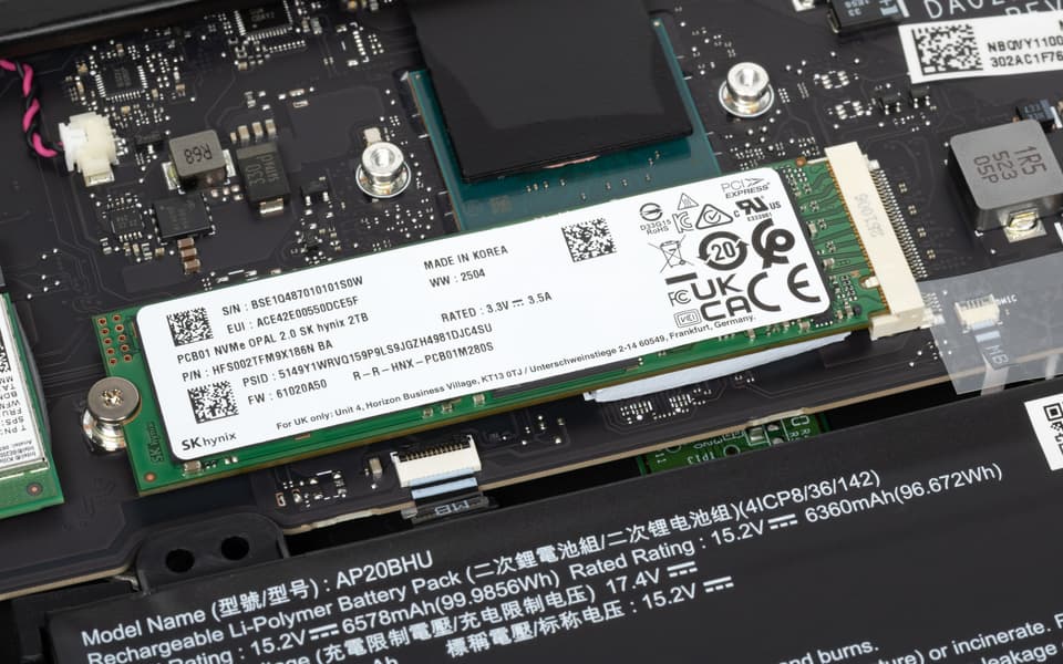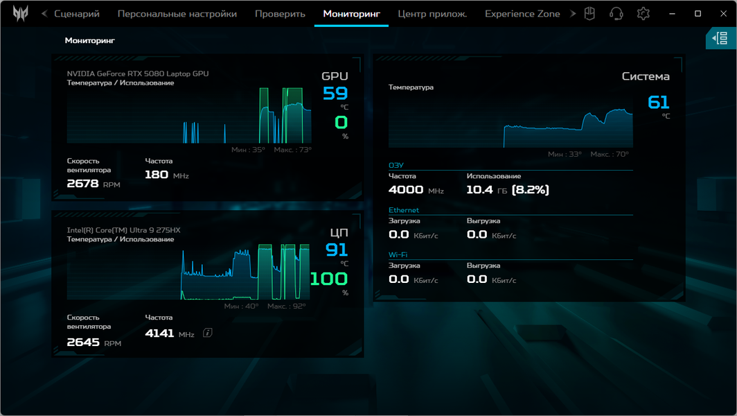 Напомним: используемая в данной модели дискретная видеокарта относится к серии Nvidia GeForce RTX 50 в версии для ноутбуков (архитектура Blackwell), для GeForce RTX 5080 Laptop ее производитель заявляет наличие 7680 ядер CUDA, 256-разрядную шину памяти с подключением 16 ГБ ОЗУ GDDR7, тактовую частоту (с ускорением) до 2287 МГц и потребление 80—150 Вт.