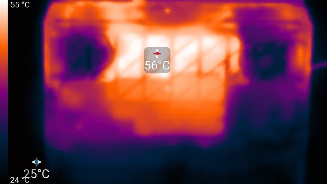Справа и слева на заднем торце корпуса, а также на боковых кромках имеются решетки, через которые система вентиляции выбрасывает нагретый воздух. Подогрева нижней части экрана при этом не происходит, поскольку он заметно выдвинут вперед относительно заднего края корпуса.