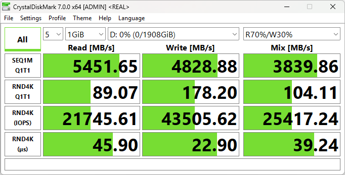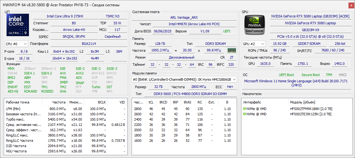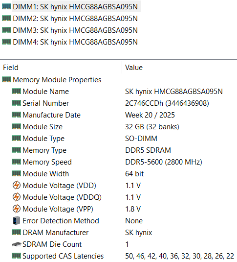 | Оперативная память | 128 (4×32) ГБ DDR5-5600 (4 × DDR5-5600 SK Hynix HMCG88AGBSA095N) все четыре слота SO-DIMM заняты | |