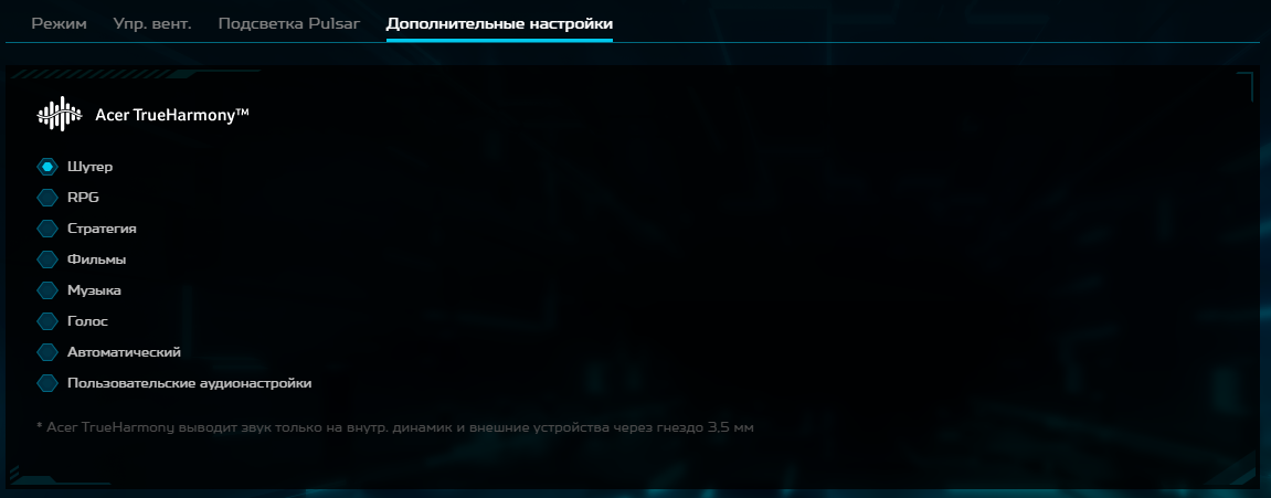 Также есть управление звуком Acer TrueHarmony.