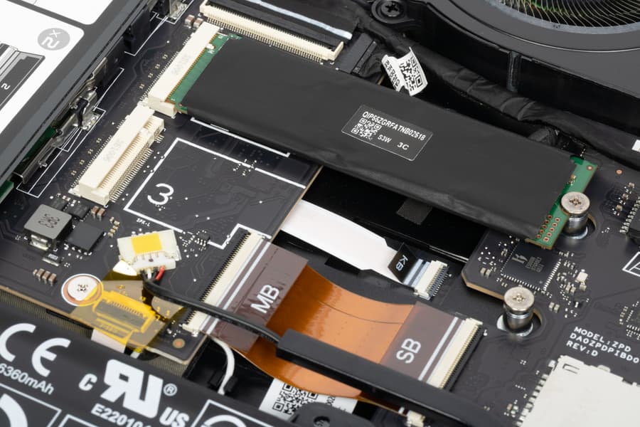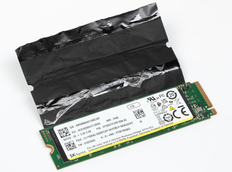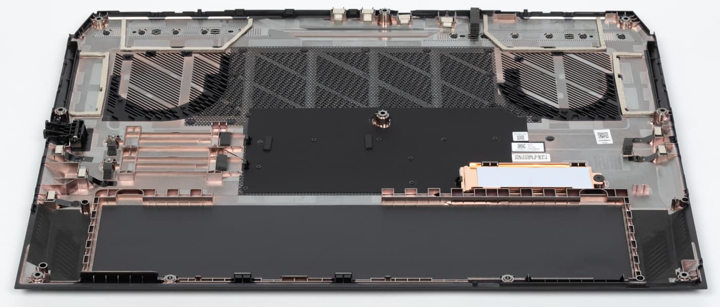 Причем и для первого, и для опционального третьего SSD на той же крышке имеются места для крепления подобных радиаторов; что помешало поставить второй радиатор — загадка, сто́ит-то он копейки. Конечно, второй накопитель более быстрый и более «горячий» (у него потребление до 3,5 А@3,3 В против 2,5 А@3,3 В у первого), а потому требует лучшего охлаждения, но тогда еще одна загадка: почему он не сделан системным?