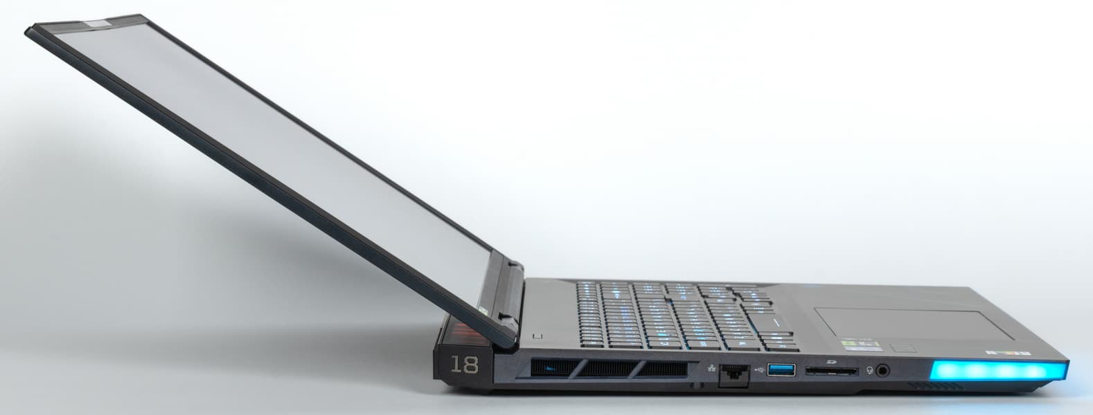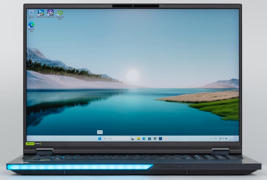 У него отличный 18-дюймовый IPS-экран с подсветкой Mini-LED, разрешением 2560×1600 (16:10) и частотой обновления 250 Гц, весьма производительные и современные процессор Intel Core Ultra 9 275HX и дискретный видеоадаптер Nvidia GeForce RTX 5080 Laptop, целых 128 ГБ ОЗУ DDR5-5600 в четырех слотах, два штатных SSD-накопителя формата M.2 2280 по 2 ТБ с возможностью установки третьего подобного, три порта USB 3.2 Type-A и два Thunderbolt 5 Type-C, видеовыход HDMI 2.1, а также SD-картовод. Дополняют картину сетевые интерфейсы Wi-Fi 7 и Ethernet на 5 Гбит/с, клавиатура с RGB-подсветкой, полноценным цифровым блоком и клавишами-стрелками нормального размера, а также очень приличный для ноутбука звук. Обилие подсвечиваемых декоративных элементов — это уже на любителя.