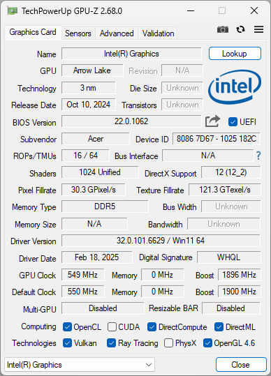 Имеется и интегрированный видеоадаптер Intel Arc Xe-LPG Graphics — понятно, в играх его использовать нет смысла.