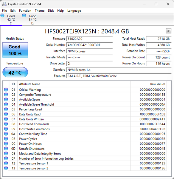 Весь доступный объем одного штатного накопителя отведен под системный раздел, на втором раздел также один, он полностью свободен.