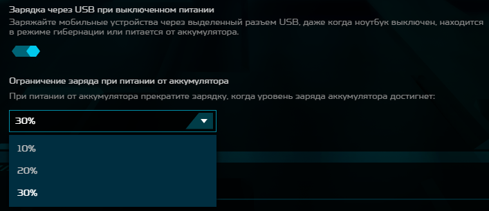Можно задействовать питание или заряд подключенных к одному из USB-портов (ближнему к передней кромке на правом боку) даже при выключении ноутбука, а также задать прекращение этого, если батарея разрядилась до одного из трех значений.