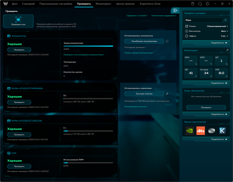 Имеется фирменная утилита PredatorSense (у нас была версия 5.1.447), которая позволяет настраивать разные функции и выбирать режимы (профили) работы, а также отображать различную информацию и тестировать «железо». Рядом с Backspace есть специальная клавиша для быстрого вызова утилиты.