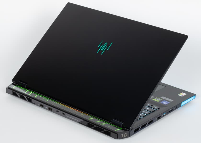 Оформление корпуса выполнено в общем стиле линейки Predator, цвет черный. Как и у очень многих мощных игровых ноутбуков, сзади есть выступающая за линию петель экрана часть.