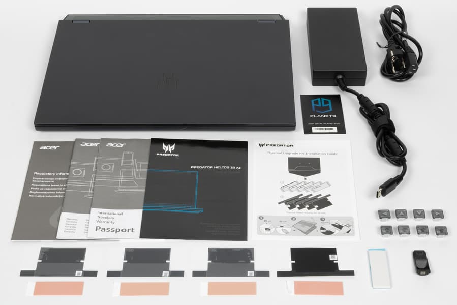 В комплекте, кроме самого ноутбука, идет блок питания со сменным входным кабелем длиной 1,2 метра и распаянным выходным (1,8 м, есть фиксатор-«липучка»), сменные прозрачные клавиши WASD и «стрелки» (есть и съемник), набор запасных термопрокладок, а также печатные материалы, в том числе на русском языке.
