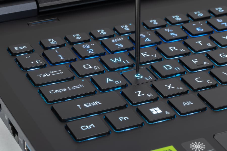 Клавиатура с механическими переключателями, островным расположением кнопок и полноценным цифровым блоком, но без выделенных Home, End, PgUp, PgDn, нет и правой клавиши Ctrl. Зато есть три отдельные кнопки для управления воспроизведением. Отступы по краям умеренные, по 22,5 мм, при этом большинство клавиш имеют обычный для ноутбуков размер 15,9×15,4 мм, кнопки цифрового блока такие же, лишь в крайнем правом ряду немного уменьшены. Функциональные клавиши еще поменьше (13,6×10 мм), левый Shift широкий — 37,9 мм, правый заметно меньше — 29,3 мм, а Enter имеет ширину 38,8 мм. Все четыре клавиши со стрелками имеют нормальный размер, но чуть сдвинуты к передней кромке корпуса.
