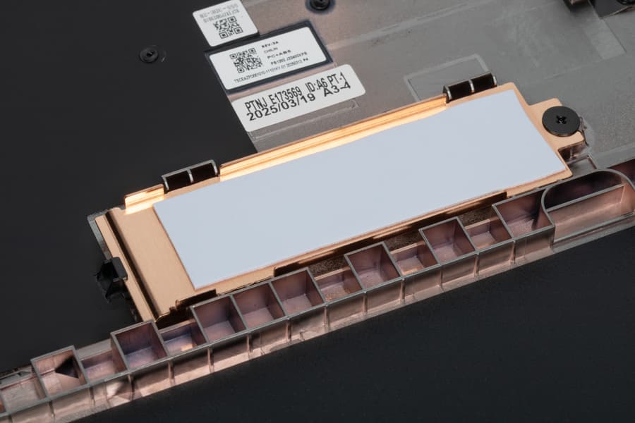 Из двух установленных в слоты М.2 накопителей один (с установленной системой) обернут термолистом, а для второго (свободного) на нижней крышке имеется простенький медный радиатор с теплопроводящей прокладкой.