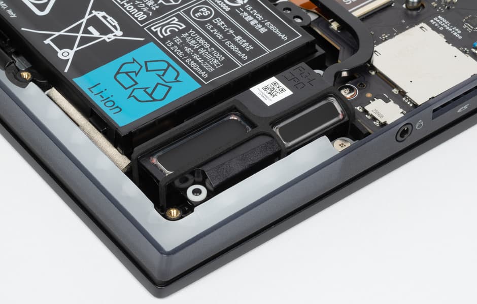 Две трети места внутри ноутбука занимают платы — большая системная с кулерами и еще одна маленькая, на которой размещены разъемы RJ-45, USB, слот SD-картовода и соответствующие электронные компоненты. Остальная часть отведена под батарею, по бокам которой находятся динамики.