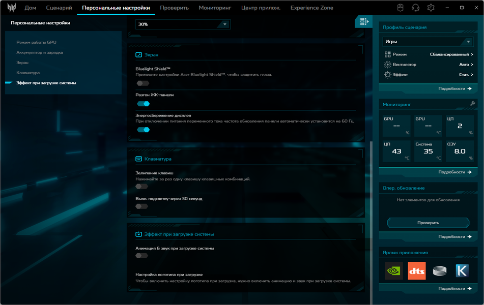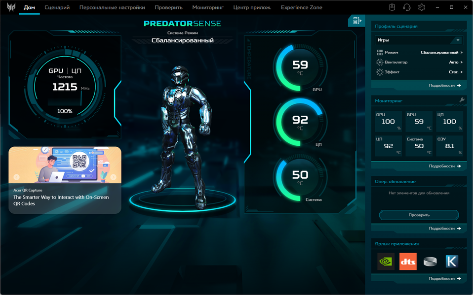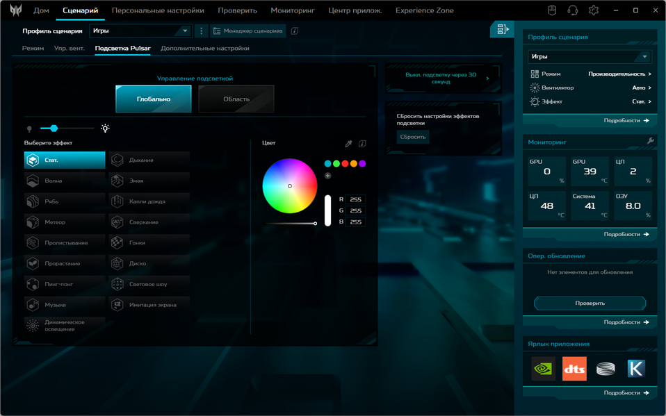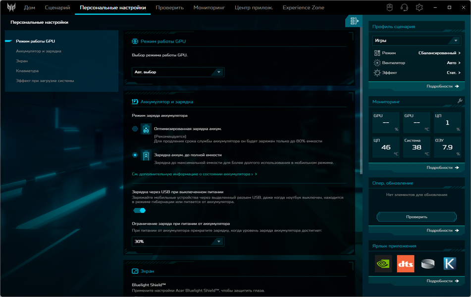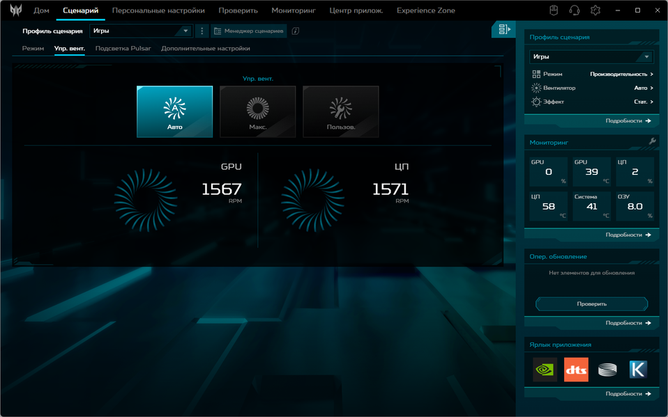 | Установка режима (профиля) в PredatorSense | ||||