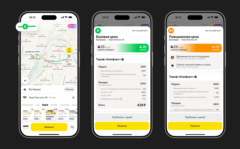 Также отображается информация о пробках и погоде, влияющих на спрос и время в пути. Это поможет понять, почему меняется цена поездки. Например, утром перед работой можно увидеть, что желающих уехать в центр больше, чем свободных водителей, поэтому включается повышающий коэффициент. Для просмотра нужно нажать на значок рубля в левом верхнем углу после выбора маршрута и тарифа.