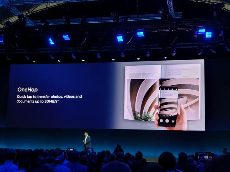 В новом MateBook X Pro дебютировала технология OneHop, смысл которой заключается в быстром обмене данными (фото, видео, документами) между смартфоном и ноутбуком. Достаточно поднести смартфон к ноутбуки, и данные, которые пользователь хочет перенести на лэптоп, едва ли мгновенно отображаются на экране последнего. Во время анонса демонстрировался обмен фото, видео и даже текста, скопированного в буфер обмена смартфона. Все прошло без запинки.