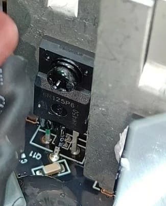 Основной преобразователь (инвертор) тут несколько сдвинут в сторону сетевого разъема относительно его обычного положения примерно в центре основной платы. Сам инвертор представляет собой комбинацию четырех транзисторов 6R125P6, которые размещены на пластинчатых радиаторах попарно.